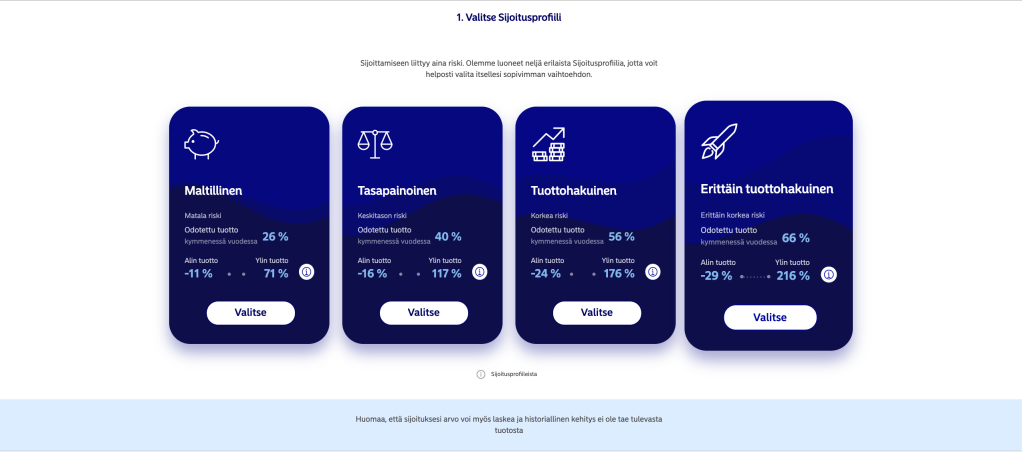 2. Seuraavaksi kysytään sijoitusaikaa ja summaa. Erityisesti sijoitusaika on tosi tärkeä, koska sen perusteella digiavustaja suosittelee rahastopalettia. Jos sijoitusaikaa on alle 10 vuotta, se suosittelee sinulle vaihtoehtoa, joka pitää sisällään myös korkorahastoja – niistä puhutaan Sijoituskaverit-podissa myöhemmin! Oletin tässä, että salkulle ollaan muuraamassa kivijalkaa pitkäksi aikaa. Siksi valinta on yli 10 vuotta. Pitkä sijoitusaika tarkoittaa, että sijoituskohteeksi voidaan valita korkeamman riskin osakerahastoja, sillä aika tasaa riskiä.