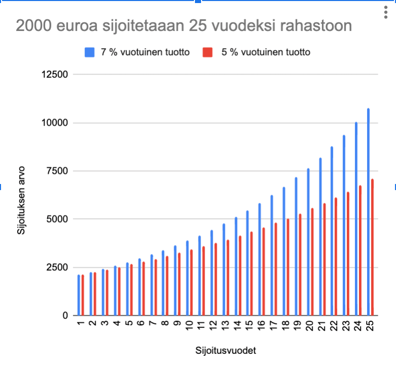 Kirjaprojektin takia olen tehnyt erilaisia harjoituslaskelmia, joista alla yksi. Siinä on tutkittu, mitä tapahtuu 1000 euron sijoitukselle rahastossa, joka tuottaa 7 prosenttia tai 10 prosenttia per vuosi 25 vuoden ajan.